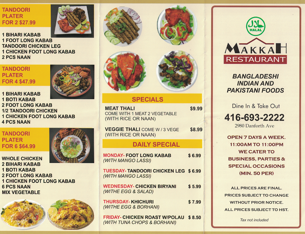Located at 2980 Danforth Ave in Toronto, MAKKAH Restaurant East York offers a delightful array of traditional Pakistani and Indian cuisine. From savory appetizers like Veg Samosa and Kaleji Samosa to flavorful meat dishes such as Lamb Curry and Karahi Chicken/Lamb, this restaurant is a haven for food enthusiasts looking to explore authentic flavors.