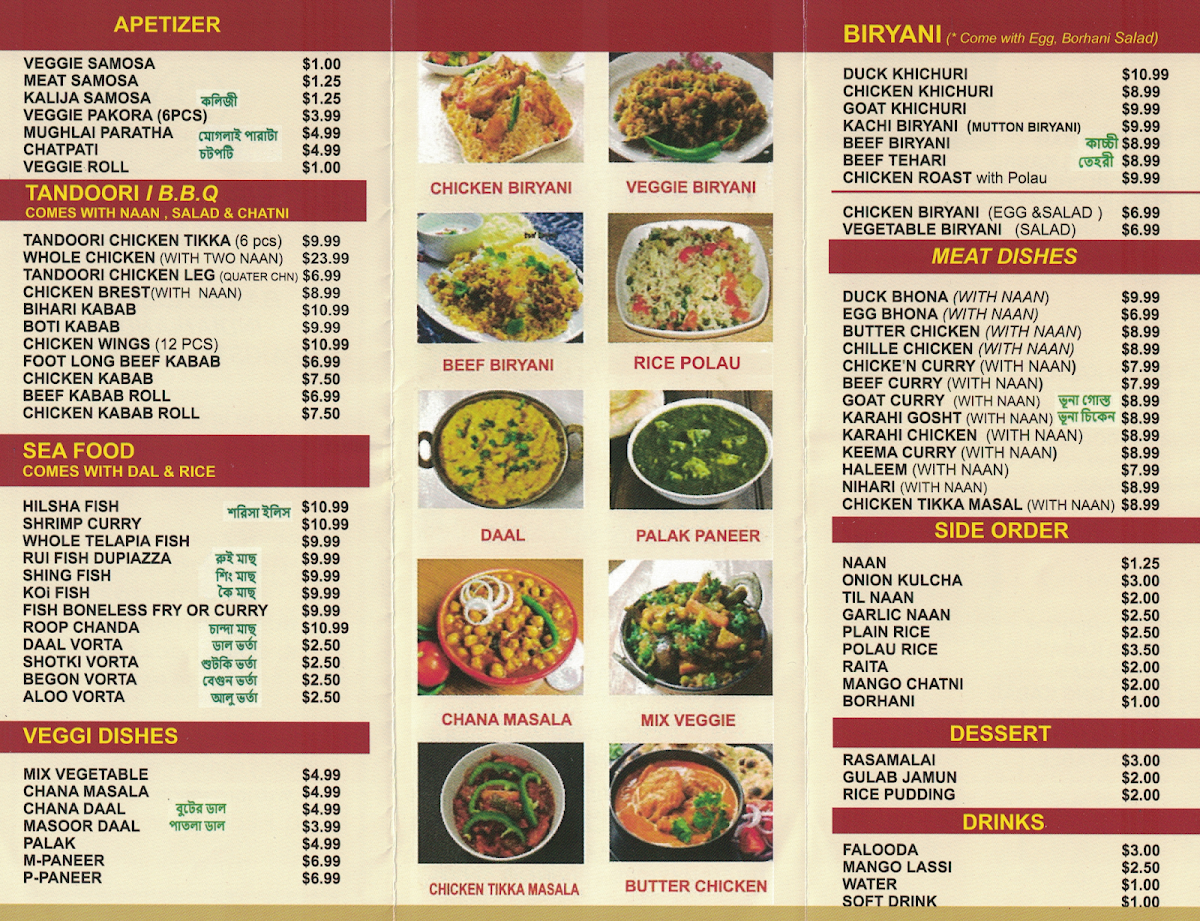 For a true taste of Bengoli flavors, the Bengoli Varta Special and Bangla Specials are sure to impress with dishes like Beef Kichuri and Duck Kichuri served with flavorful sides. And don't forget to finish off your meal with a refreshing beverage like Burhani or Falooda.